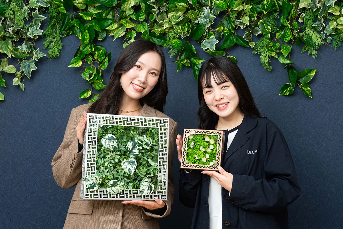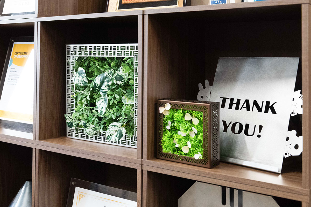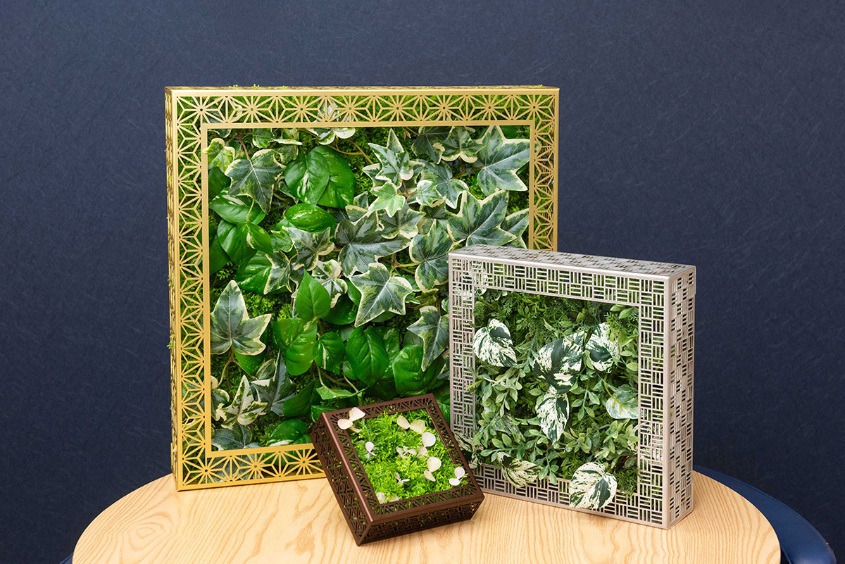 香山:金属との組み合わせによって植栽に高級感を加えることができるようになりました。オフィスだけでなく、ホテルやカフェなどへの展開も考えています。フレームにレーザー加工で企業のロゴや名前を入れられるようになれば、お客さまに喜ばれるのではないかと思っています。また、正方形のほかに長方形タイプの開発も現在検討しているところです。これまでは、空間に合わせて現場で植栽のやり方を考えるのが常でしたが、金属フレームという商品を使うことにより、提案の幅が広がりそうです。今回のコラボによって全く新しい発想が生まれたことに感謝しています。