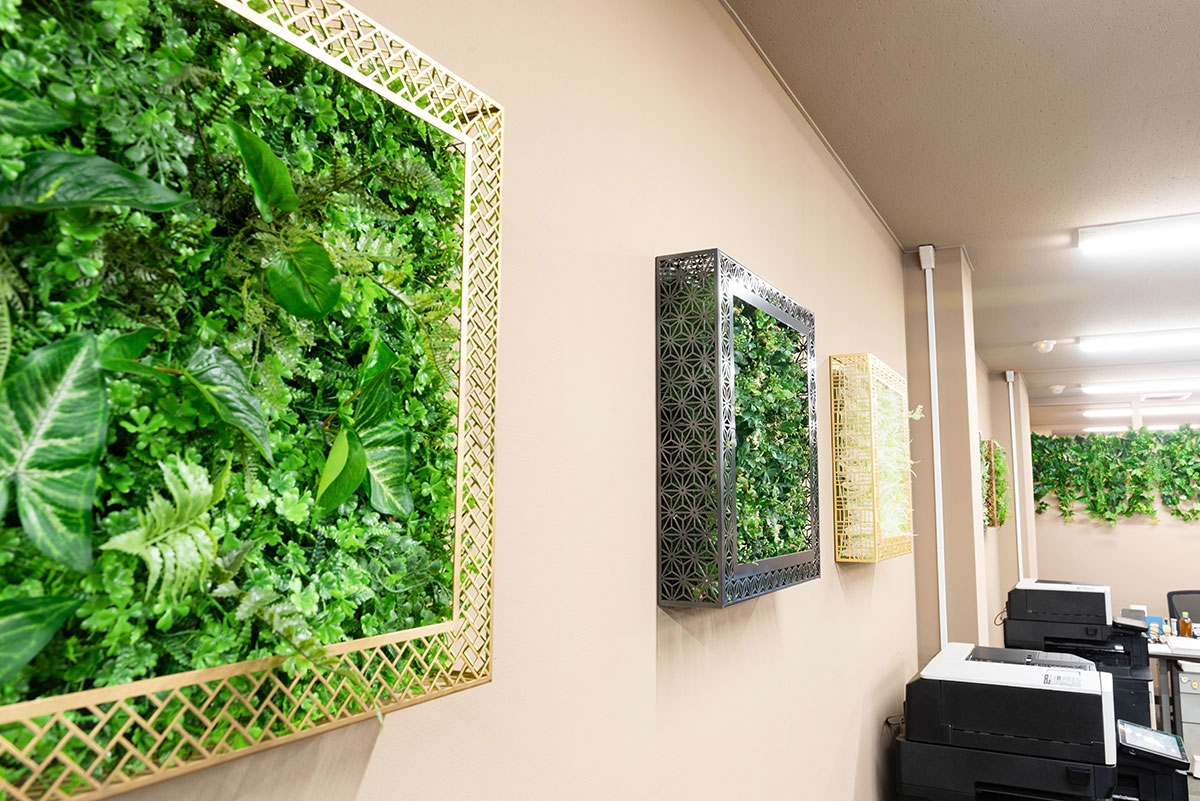 香山:事務所の空間で存在感を発揮できるよう、フレームの大きさについては50cm四方としました。設計にあたっては、植栽や壁面施工に適した構造などをアドバイスしました。試作を経て、強度面などの改善を加えていき、完成しました。